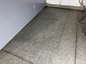 エントランス石材のもらい錆除去の依頼を頂きました 石材直に金属製ポストが置いてあり、そりゃ錆もらうよね、という感じでした。置いてあった痕は消えませんでしたが錆は95パーセント除去できました。