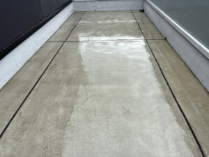 地元中野区でスポットクリーニング依頼がありました。ルーフバルコニーのモルタル床 高圧洗浄作業前作業後 因みに雨天でした。